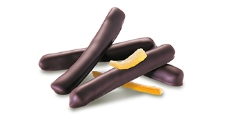 ÉCORCES D'ORANGE CONFITES ENROBÉES DE CHOCOLAT NOIR À 70% DE CACAO.
