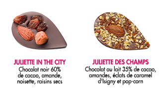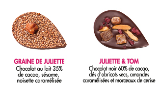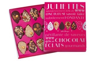 Charmantes, élégantes et craquantes les Juliettes s’invitent au dessert. Laissez-vous séduire par ces 26 fins chocolats parsemés de fruits secs. A savourer pour toutes les petites pauses gourmandes.