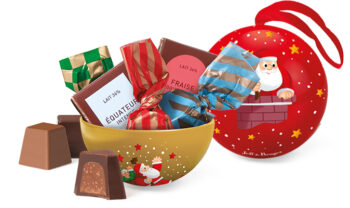 Eh oui, avec Jeff de Bruges les cadeaux se cachent aussi dans les branches du sapin de Noël ! Les boules en métal sont garnies de délicieux Choco’pralinés et de carrés en chocolat au lait.